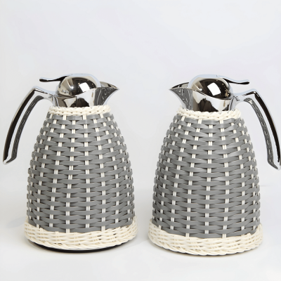 طقم مطارات ستيل مع غطاء من الجلد و راتان باللون الرمادي،الجدار مبطن بزجاج مزدوج يحفظ الحرارة لمدة 12 ساعة مع كبسة ضغط في الاعلى.