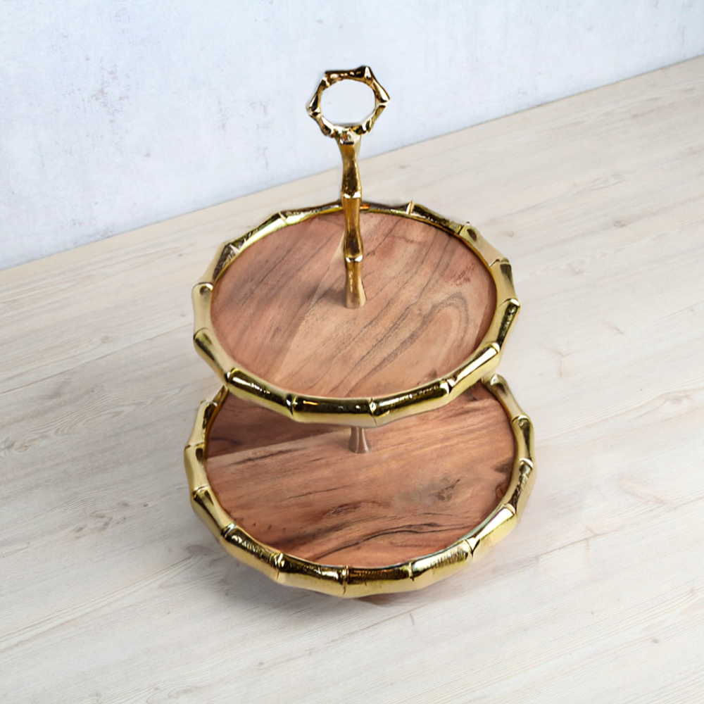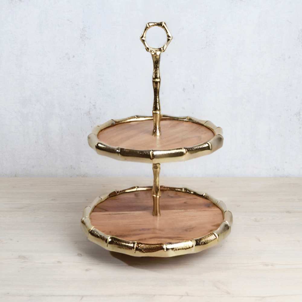 قدم لضيوفك ستاند الكيك الأنيق هذا الذي يتميز بطبقتين من الخشب مزينتين بحواف حلزونية من الألومنيوم .