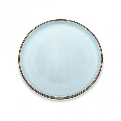 صحن عشاء دائري حجم كبير بورسلين باللون الازرق الفاتح بخط باللون البني انيق وجذاب علي الطاوله متعدد الاستخدامات الاطباق الرئيسية والحلوي والفواكه والمعجنات ، للمناسبات والحفالات والمنازل