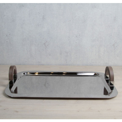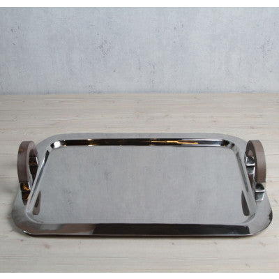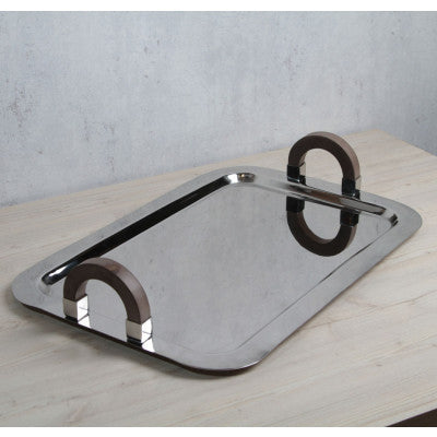 صينية تقديم مستطيلة جميلة بمقبض خشبي وسطح من الستانلس ستيل