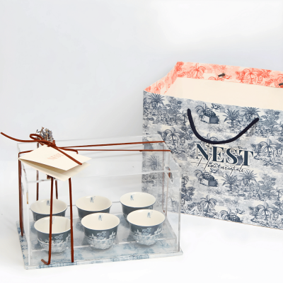 يتكون من عدد 6 فناجين قهوة عربية مطبوعة برسومات مستوحاة من البيئة الصحراوية الخليجية باللون الازرق بالاضافة الى بوكس اكريليك بغطاء.