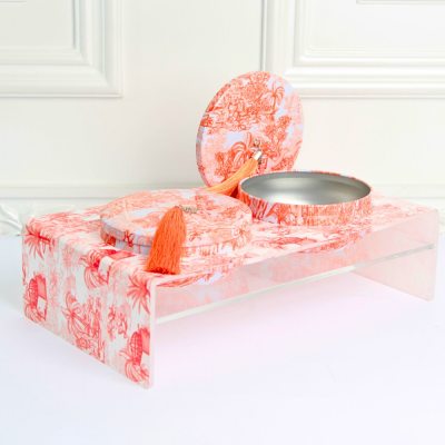 ستاند تقديم يحتوي على عدد (2) علب بطبعة الجزيرة باللون البرتقالي.