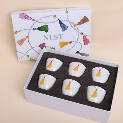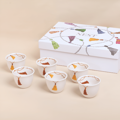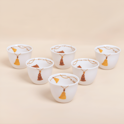 المادة: يتكون الطقم من عدد (6) فناجين بتصميم كراكش باللون الاسود و الرمادي , مصنوعة من السراميك عالي الجودة.