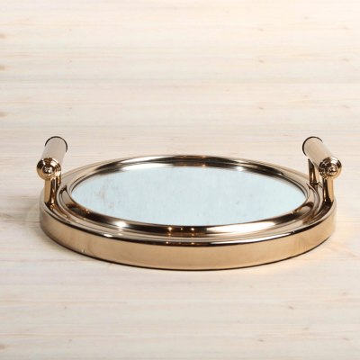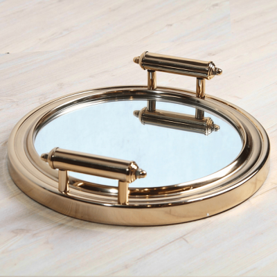 صينية تقديم دائرية جميلة مع مقابض من الستانلس ستيل المصقول باللون الذهبي وسطح مرآة