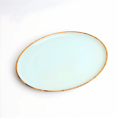صحن بيضاوي بورسلين - وسط وصف المنتج طبق بيضاوي بورسلين حجم وسط باللون الارزق الفاتح محدد بخط بالبني بشكل انيق وجذاب علي الطاولة يصلح للاطباق الجانبية الحلوي والفواكه والمعجنات في المناسبات والحفلات والمنازل