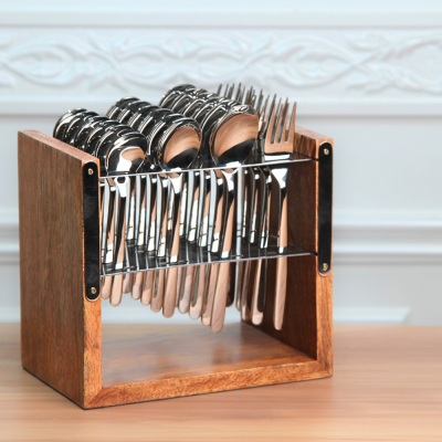 طقم أدوات المائدة ركاز باللون السلفر مع ستاند خشبي - 24 قطعة