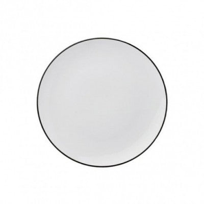 صحن بورسلين باللون اوف وايت محدد الاطراف بخط اسود شكل دائري انيق وجذاب علي الطاولة حجم كبير للاطباق الجانبية الحلوي والفواكه والمعجنات مناسب للحفلات والمنازل والفنادق