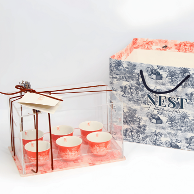 يتكون من عدد 6 فناجين قهوة عربية مطبوعة برسومات مستوحاة من البيئة الصحراوية الخليجية باللون البرتقالي بالاضافة الى بوكس اكريليك بغطاء.