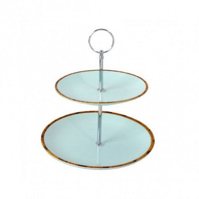 حامل تقديم من البورسلين مع يد من الاستيل ، الحامل باللون الازرق الفاتح محدد باللون البني باللون الازرق الانيق والجذاب علي الطاوله يتكون الحامل من طبقان ، يستخدم لتقديم الحلوي والشكولاته والمعجنات والفواكه يستخدم للمناسبات والحفلات والمنازل