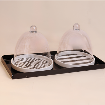 أطباق كيك بتصميم شريط أسود مع غطاء وصينية أكريليكية