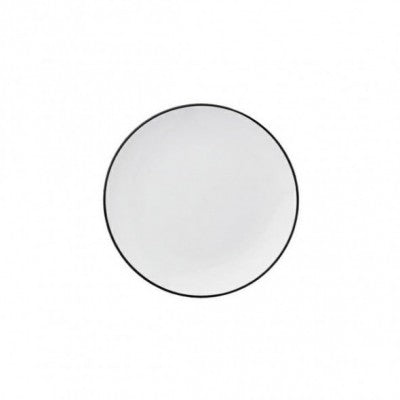 صحن بورسلين باللون اوف وايت محدد الاطراف بخط اسود شكل دائري انيق وجذاب علي الطاولة حجم وسط للصحون الجانبية الحلوي والفواكه والمعجنات مناسب للحفلات والمنازل والفنادق