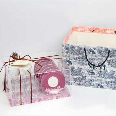 يتكون من عدد 6 استكانات + 6 صحون مطبوعة برسومات مستوحاة من البيئة الصحراوية الخليجية باللون البنفسجي بالاضافة الى بوكس اكريليك بغطاء.