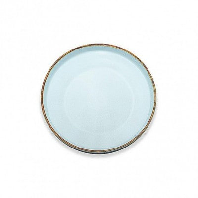صحن عشاء دائري حجم وسط بورسلين باللون الازرق الفاتح بخط باللون البني انيق وجذاب علي الطاوله متعدد الاستخدامات الاطباق الرئيسية والجانبية للحلوي والفواكه والمعجنات ،للمناسبات والحفالات والمنازل