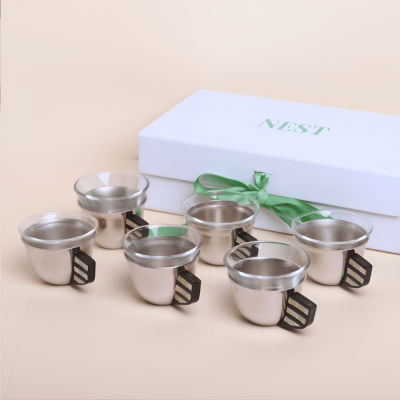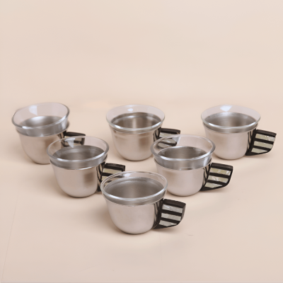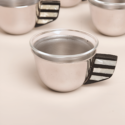 طقم فنجان القهوة العربي المصنوع يدوياً قاعدة ستيل تمنحه الثبات، ومقبض خشبي يزين بحبات من الصدف. يجمع هذا الفنجان بين الأصالة والفخامة والجمال