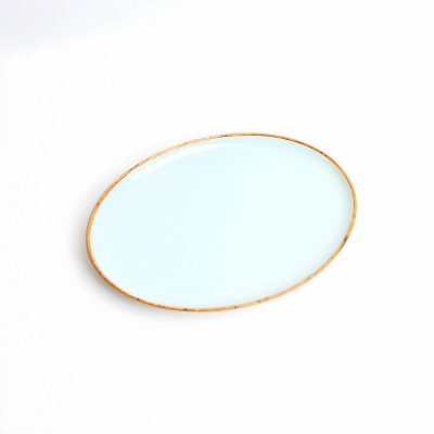 صحن بيضاوي بورسلين حجم صغير باللون الارزق الفاتح محدد بخط بالبني بشكل انيق وجذاب علي الطاولة في المناسبات والحفلات والمنازل