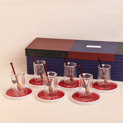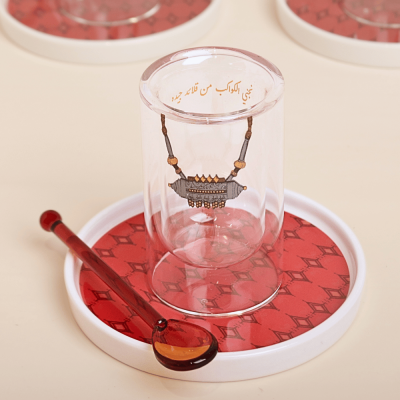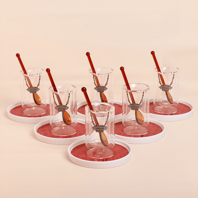 استكانات بتصميم الحُلِي مع صحون ومعالق، أحمر - 6 قطع