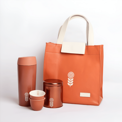 مجموعة القهوة العربية مع شنطة جلد - برتقالي