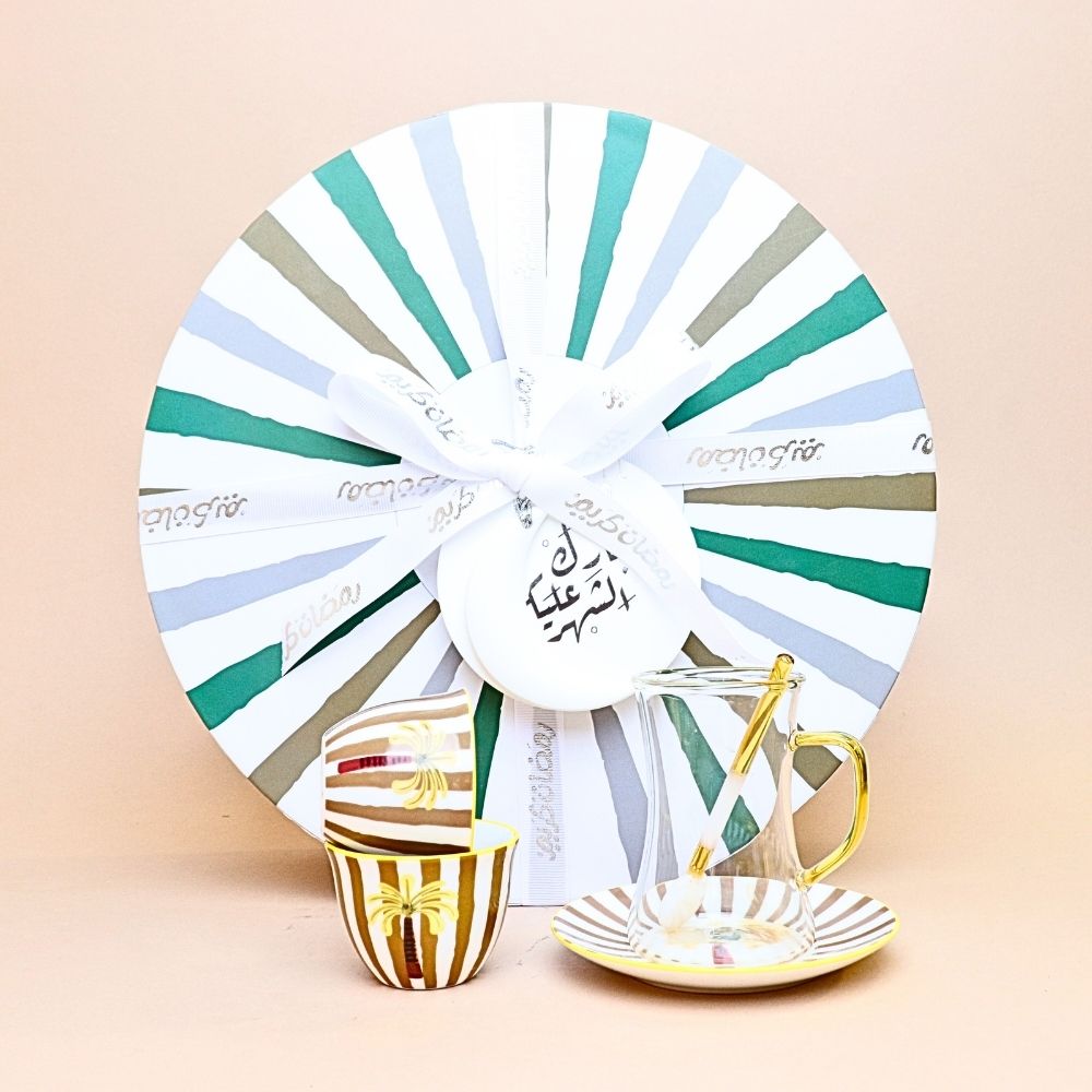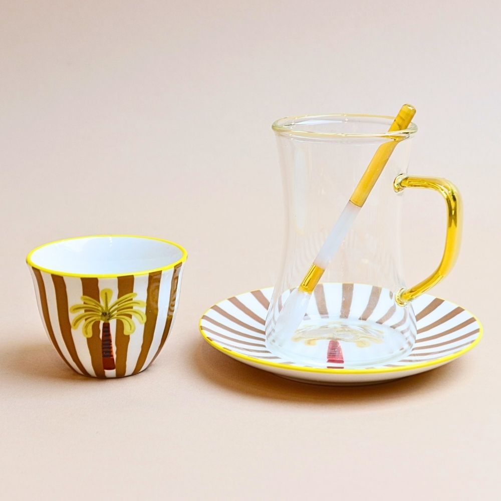 طقم استكانة وفناجين مخططة مع صحن وملعقة – 24 قطعة ( أصفر خردلي)