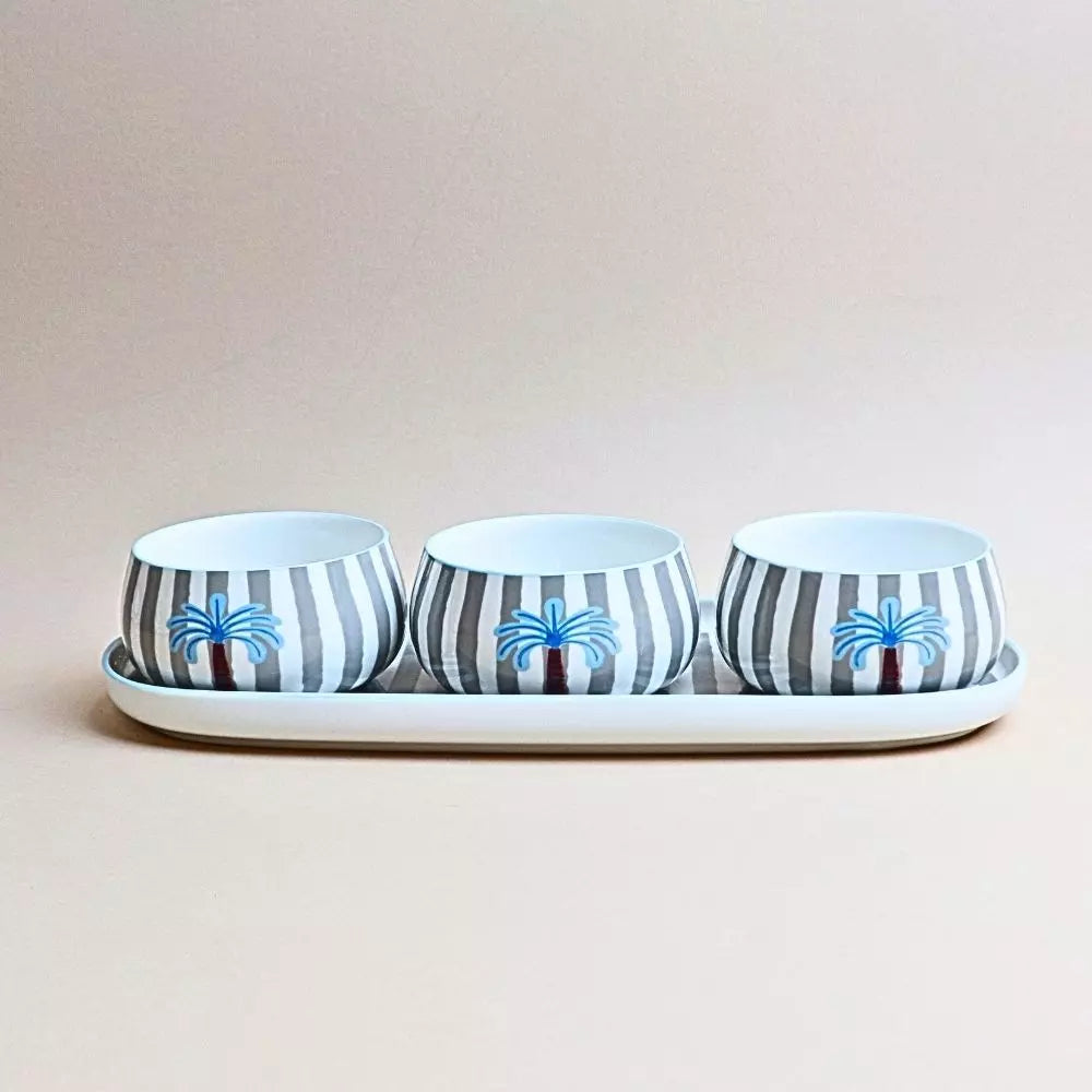 صينية بيضاوية مخططة مع 3 سلطانيات – رمادي