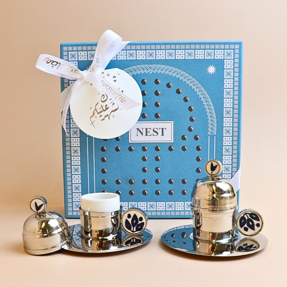 طقم فنجانين تركيين من الفولاذ المقاوم للصدأ مع صحن