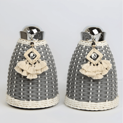 طقم مطارات ستيل مع غطاء من الجلد و راتان باللون الرمادي،مع كركوشة راتان لون اوفوايت قهوة وشاي ،الجدار مبطن بزجاج مزدوج يحفظ الحرارة لمدة 12 ساعة مع كبسة ضغط في الاعلى.