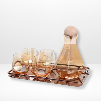 طقم دولكة زجاجية من الكريستال والزجاج مع غطاء خشبي كروي مع 4 أكواب وصينية