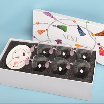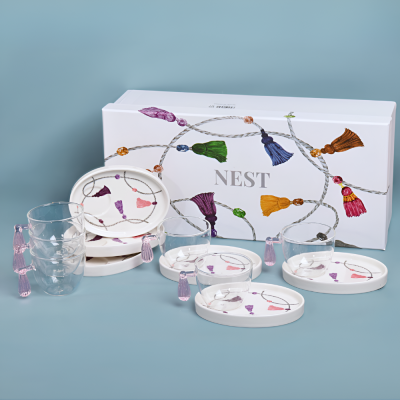 المادة: يتكون الطقم من عدد (6) فناجين زجاجية شفافة مع مقابض بتصميم كراكش باللون الوردي, و عدد (6) صحون فناجين مصنوعة من السراميك عالي الجودة.