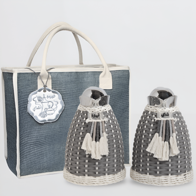 طقم مطارات ستيل مع غطاء من الجلد و راتان باللون الرمادي مع كركوشة رتان لون اوفوايت قهوة وشاي مع شنطة الجوت رمادي ، الجدار مبطن بزجاج مزدوج يحفظ الحرارة لمدة 12 ساعة مع كبسة ضغط في الاعلى.
