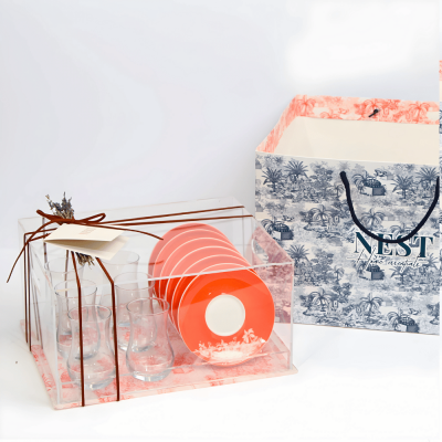 يتكون من عدد 6 استكانات + 6 صحون مطبوعة برسومات مستوحاة من البيئة الصحراوية الخليجية باللون البرتقالي بالاضافة الى بوكس اكريليك بغطاء.
