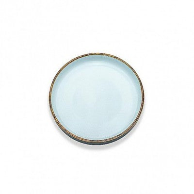 صحن دائري حجم صغير بورسلين باللون الازرق الفاتح محدد بخط باللون البني انيق وجذاب علي الطاوله للمنازل والحفلات والمناسبات ويصلح للاطباق الجانبية الحلوي والفواكه والمعجنات