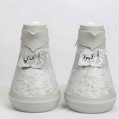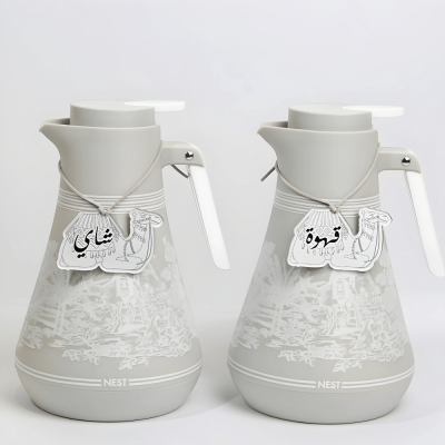 طقم مطارات مصنوعة من البلاستيك باللون الرمادي مع طبعة .الجدار مبطن بزجاج مزدوج لحفظ الحرارة لمدة 8 ساعة مع كبسة ضغط في الاعلى .